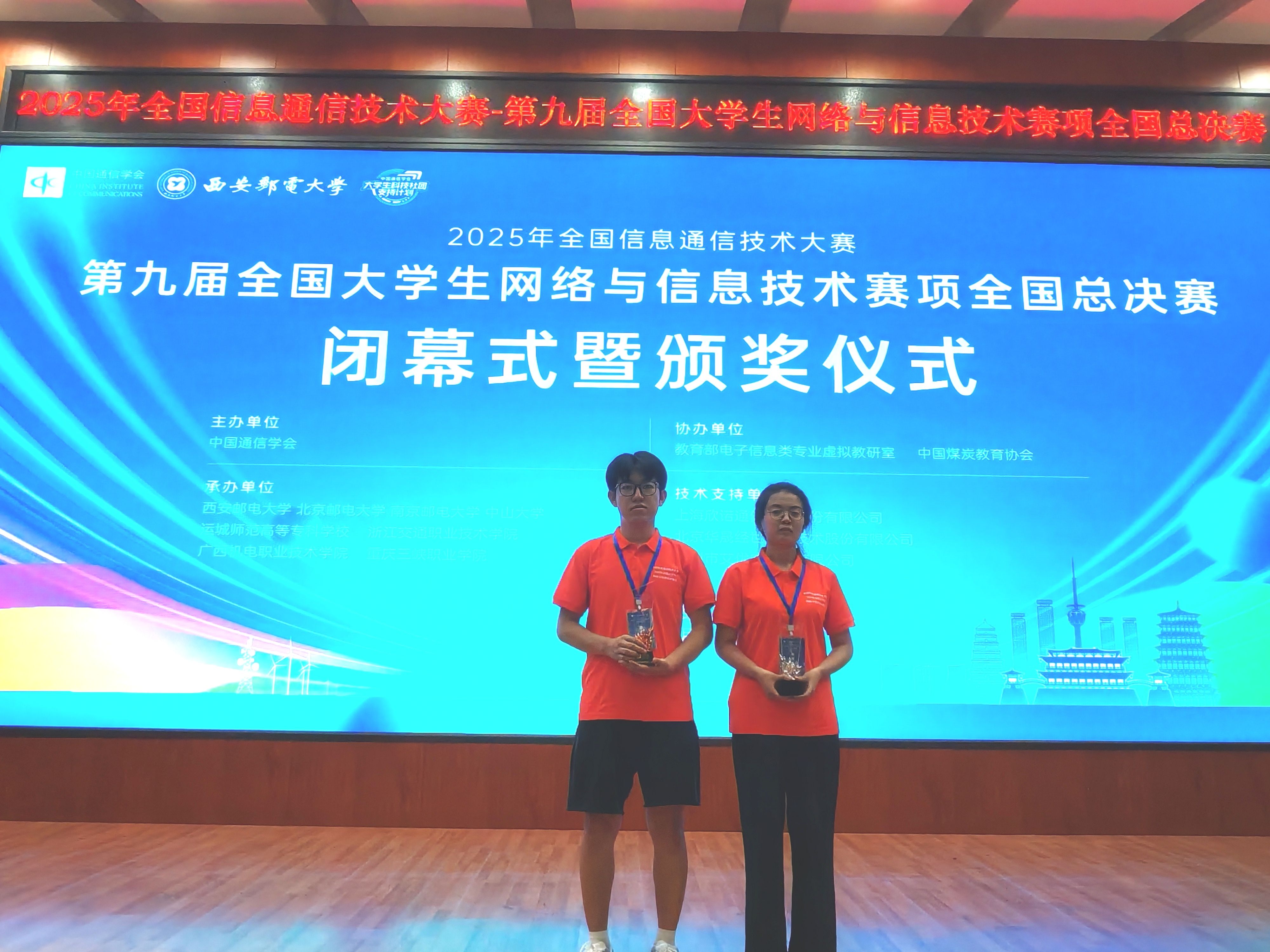 8月23日,2025年全国信息通信技术大赛——第九届全国大学生网络与信息技术赛项全国总决赛在西安邮电大学圆满落幕。我校电子工程学院教师李军芳、王丽带领通信工程专业学生芦阳、电子信息工程专业学生南乔乔参赛,经过激烈角逐,最终荣获二等奖、三等奖各一项。
