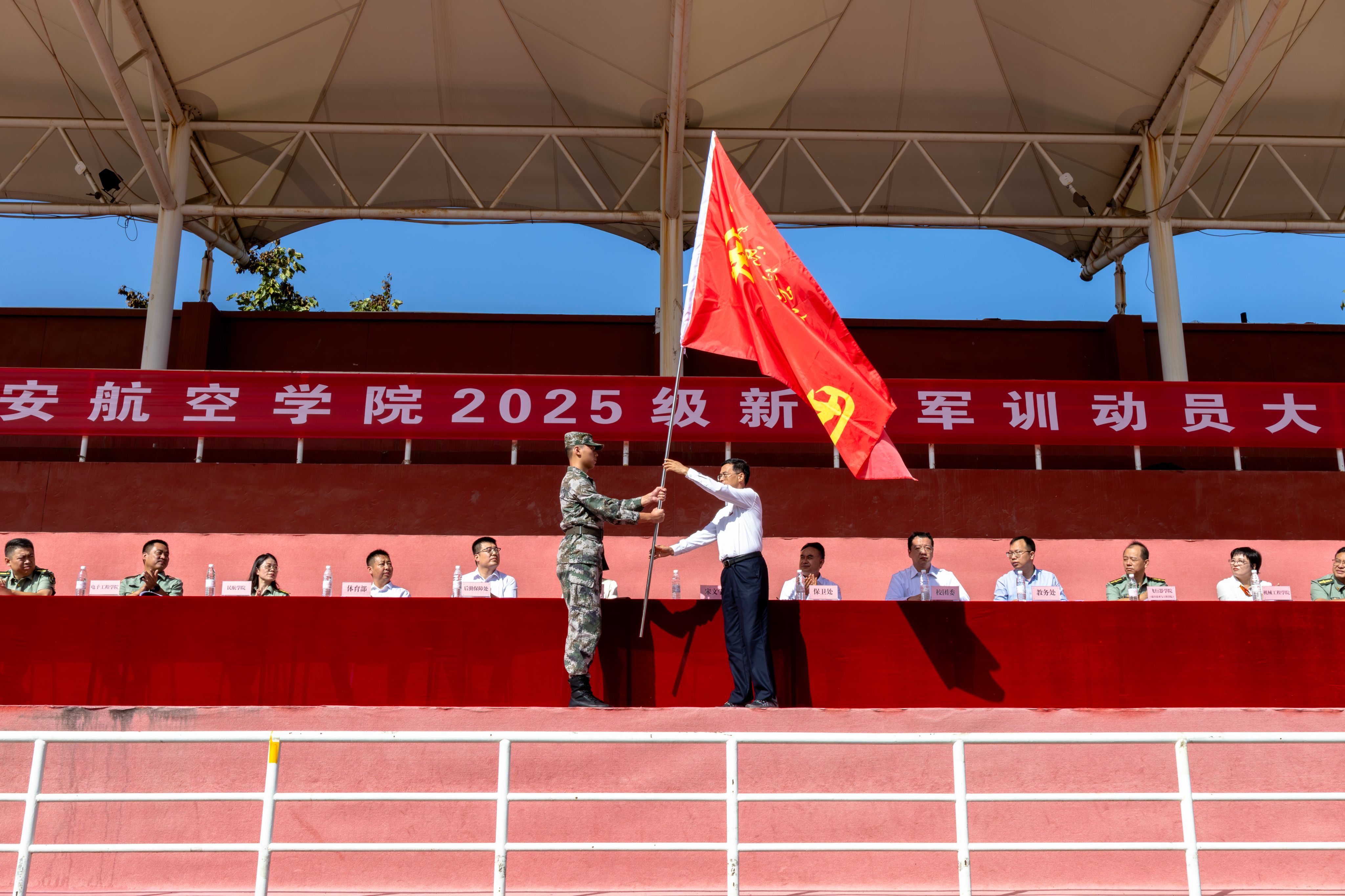 宁永录、宋文学向2025级新生军训团授团旗。