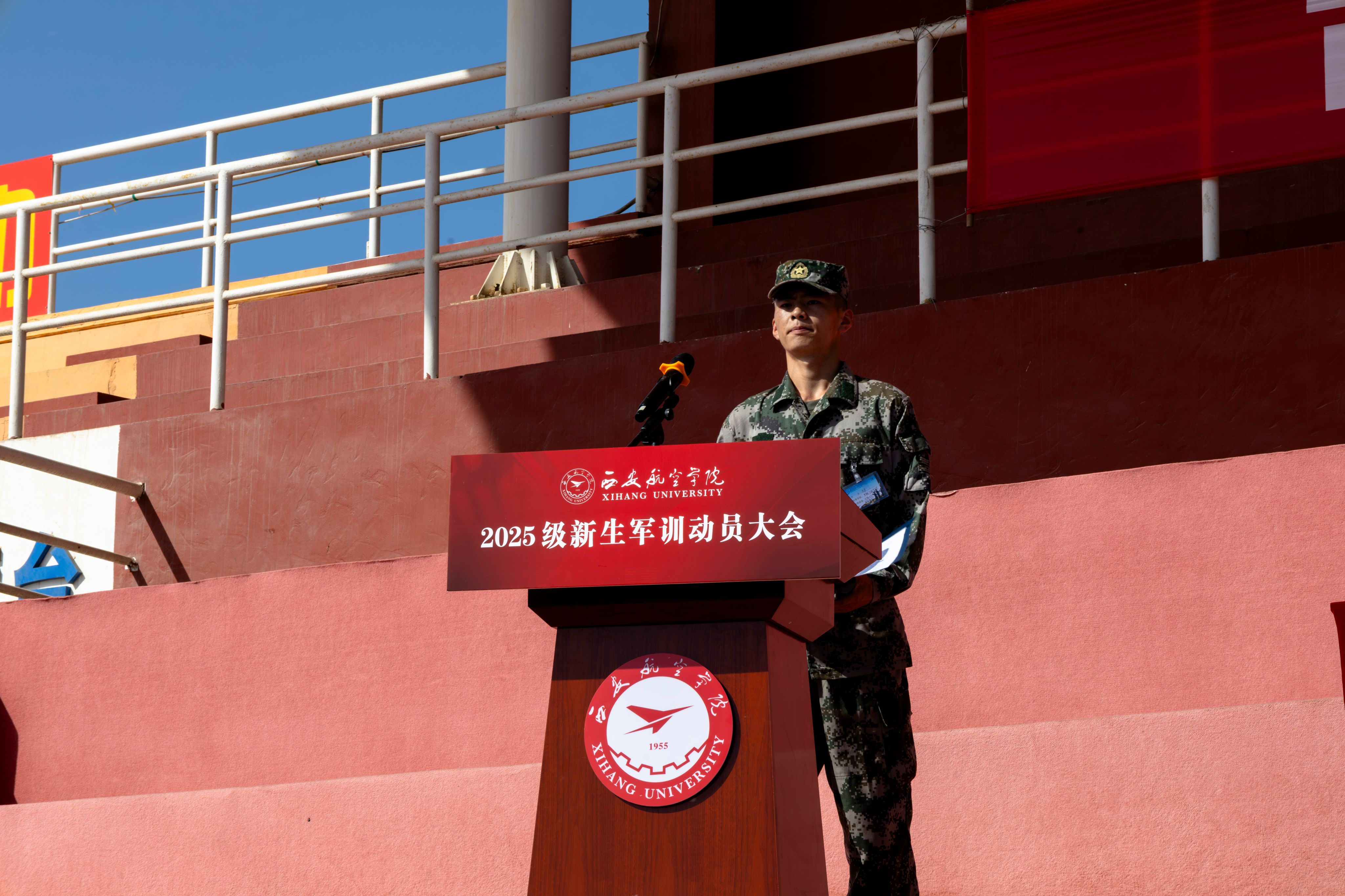 人文与外国语学院商英252班高靖泞、民航学院航服252班周欣晨代表2025级新生发言,承诺在军训期间严格要求、服从命令、听从指挥,努力完成训练任务,倡议同学们严守纪律、刻苦训练、积极应对挑战。