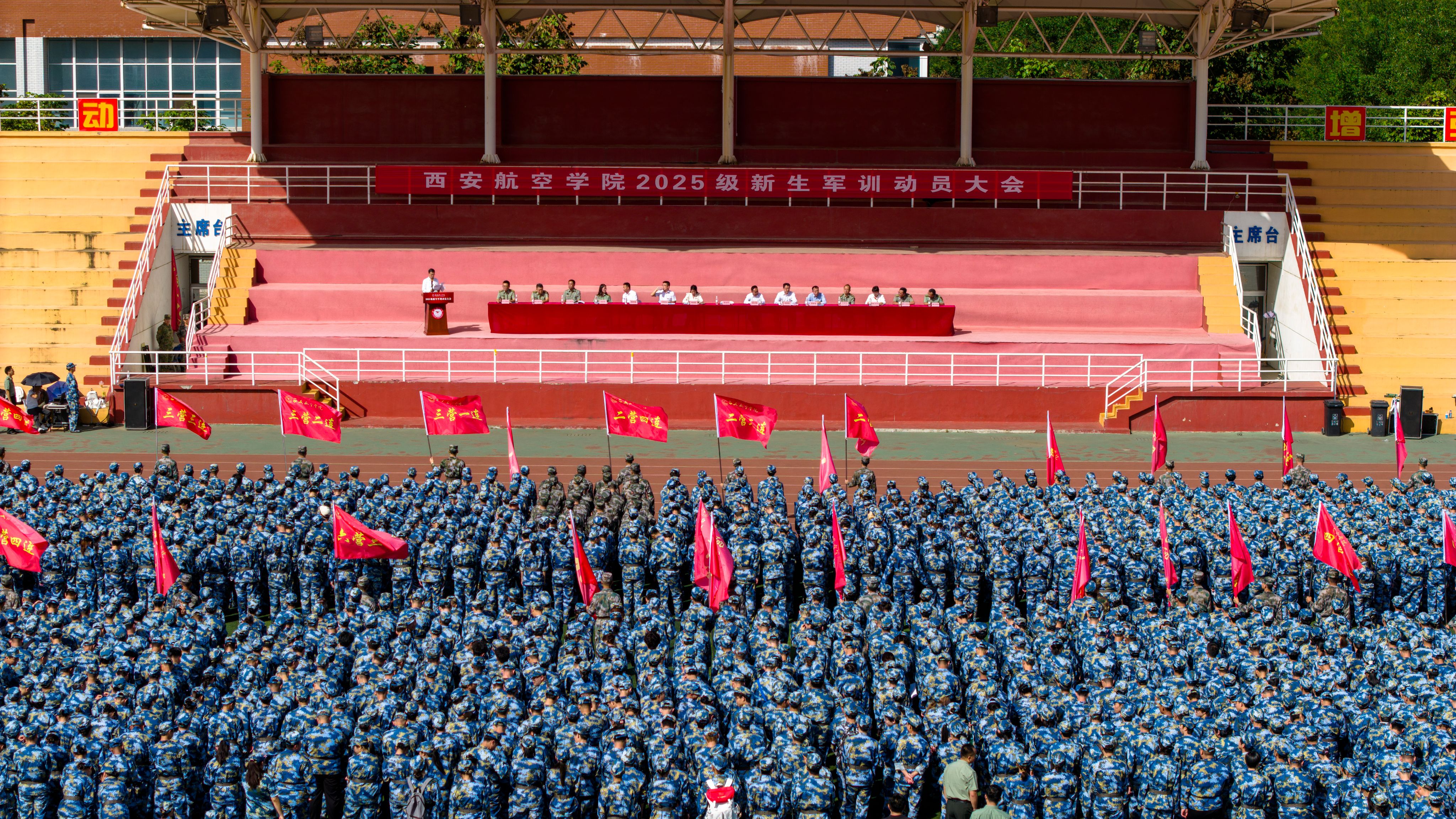 9月8日上午,2025级学生军训动员大会在两校区田径运动场同时举行。党委副书记宁永录、校领导宋文学,学生工作部(处)、教务处、保卫处、后勤保障处、校团委、校医院、体育部等部门负责人,各二级学院党总支书记、副书记、学工办主任、新生辅导员、军训教官及2025级全体新生参加大会。本次莲湖、阎良两校区动员会分别由学工部副部长吴伟刚、刘佳主持。