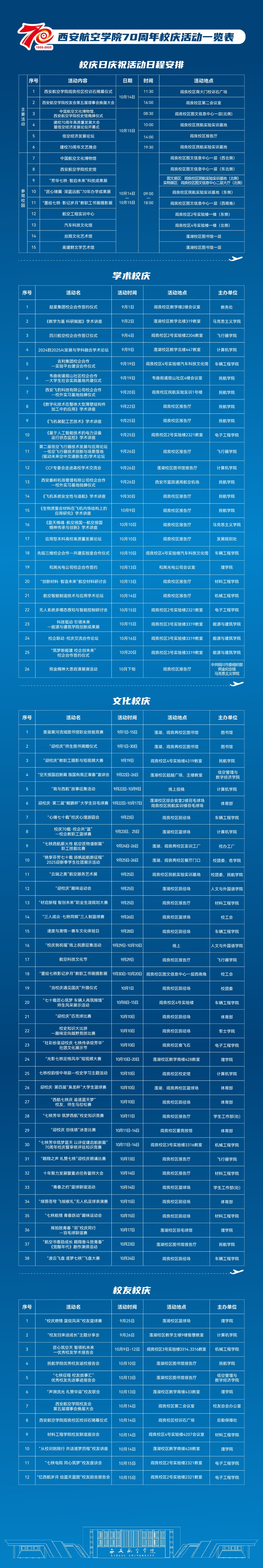 2025年10月15日,西安航空学院将迎来建校70周年。为回顾发展历史,展现建设成就,汇聚校友智慧与资源,增强发展合力,加快建设航空特色鲜明的高水平应用型大学,学校将于9月至10月,围绕“学术校庆、文化校庆、校友校庆”三大主题,集中开展一系列校庆活动。欢迎全校师生、全球校友、各界朋友同襄盛举,共庆华诞。
