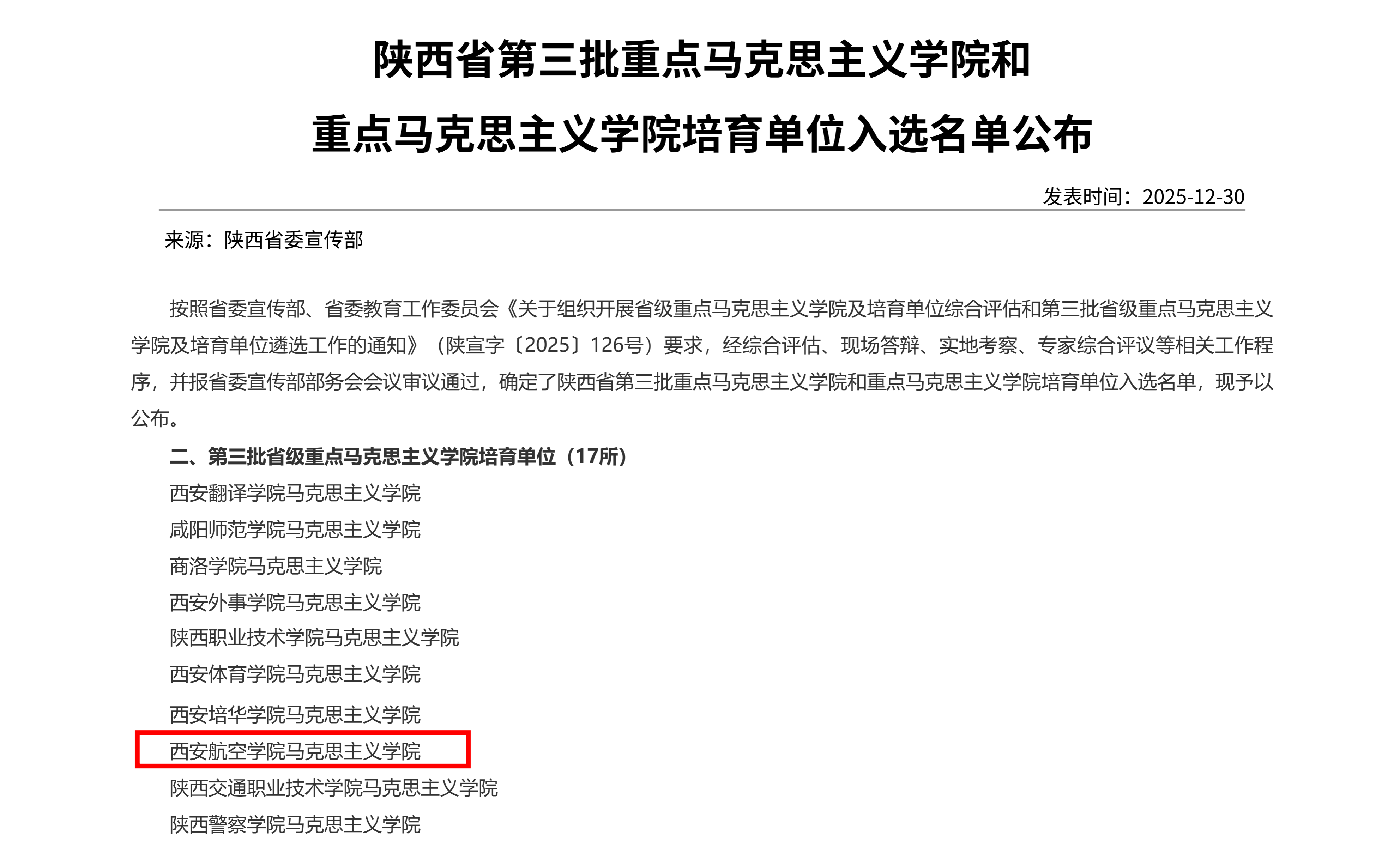 12月30日,中共陕西省委宣传部发文公布第三批省级重点马克思主义学院、重点马克思主义学院培育单位入选名单。我校马克思主义学院提早筹划、积极申报,经过综合评估、现场答辩、实地考察、专家综合评议等工作程序,成功入选陕西省第三批重点马克思主义学院培育单位。