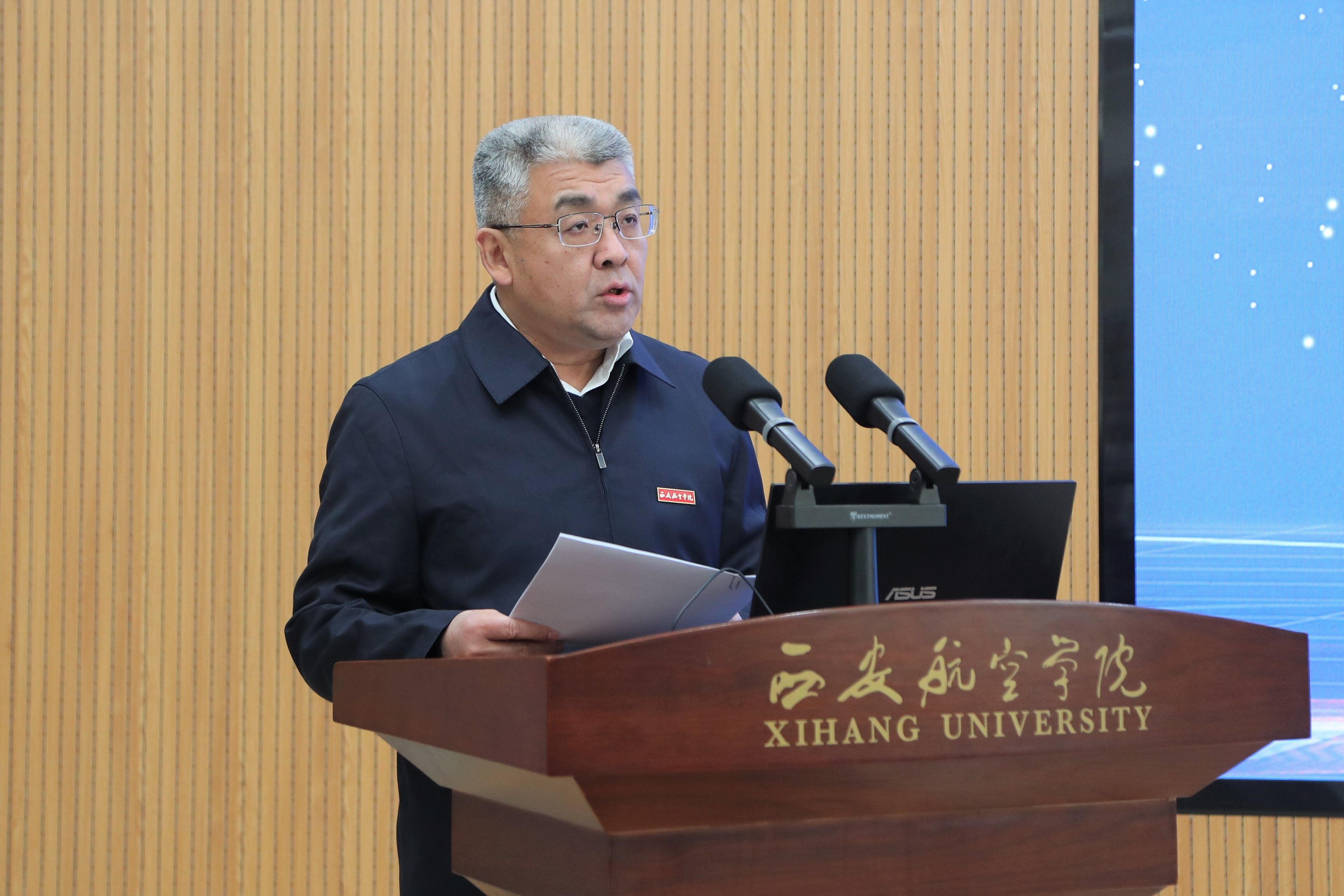 阎良区政府代区长、航空基地管委会主任贺卫涛,阎良区人大常委会副主任王芳,航空基地管理委员会副主任夏楠;中航西飞副总经理杨锋,一飞院专务、飞豹科技董事长杨毅,试飞院科技委副主任张建琳,强度所科技委副主任曹琦等航空企事业单位领导;西安航空学院党委书记祁玉龙、校长蒲永平及全体校领导出席会议。来自航空基地相关部门、50余家涉航企业、金融机构的代表以及学校各学院和职能部门科级以上干部、各学院正高级职称人员和近三年新进教师代表等300余人参加会议。会议由校领导宋文学主持。