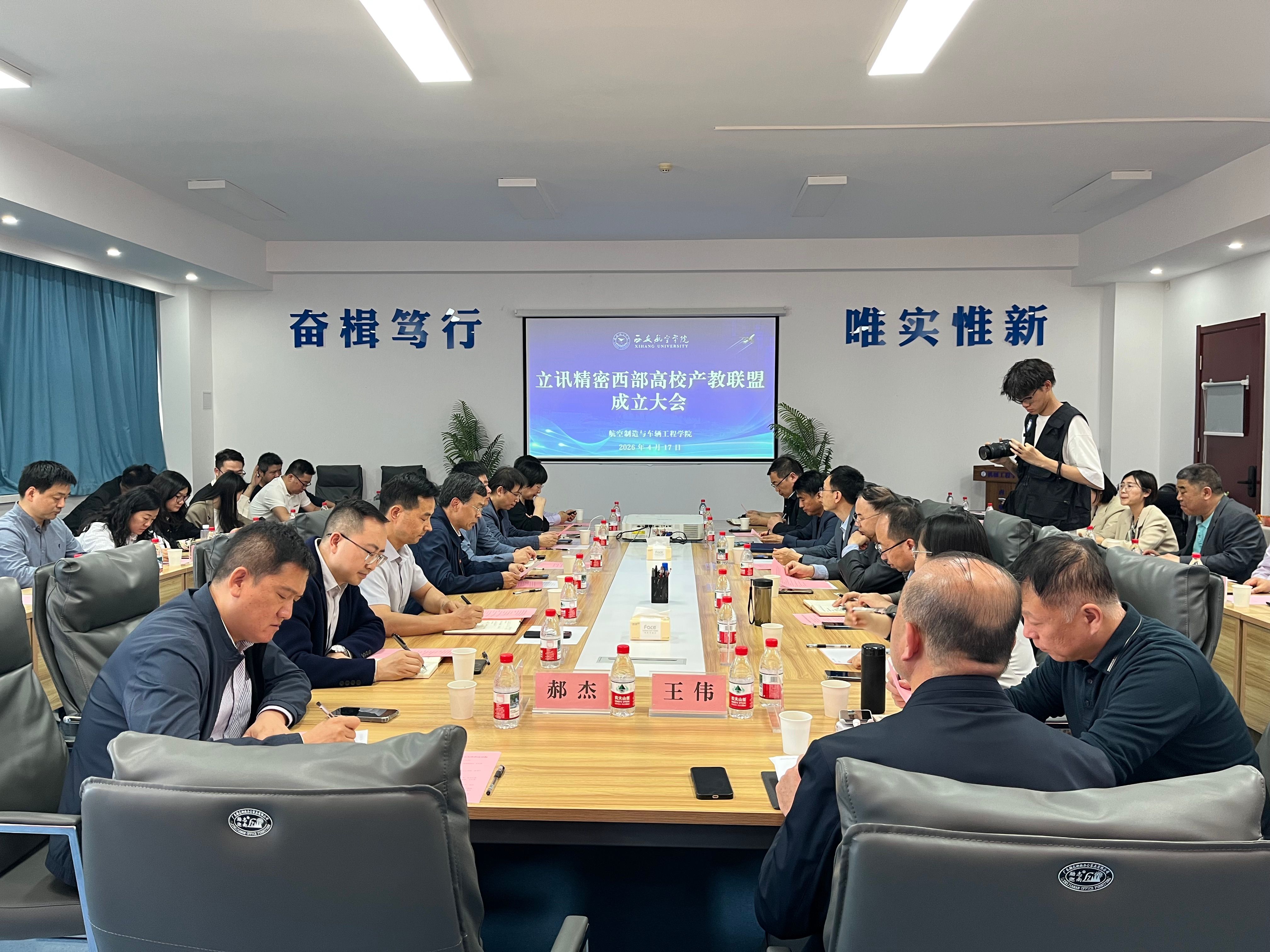 为深化产教融合、推动校企协同育人,4月17日下午,立讯精密西部高校产教联盟成立大会在西安航空学院阎良校区隆重举行。立讯集团、西安工业大学、陕西理工大学、陇东学院、宝鸡文理学院、西安文理学院、兰州工业学院、兰州信息工程学院、西京学院、西安交通大学城市学院等10所西部高校代表30余人齐聚一堂,共探产教融合创新发展之路。校领导宋文学出席会议,大会由航空制造与车辆工程学院院长王永锋主持。