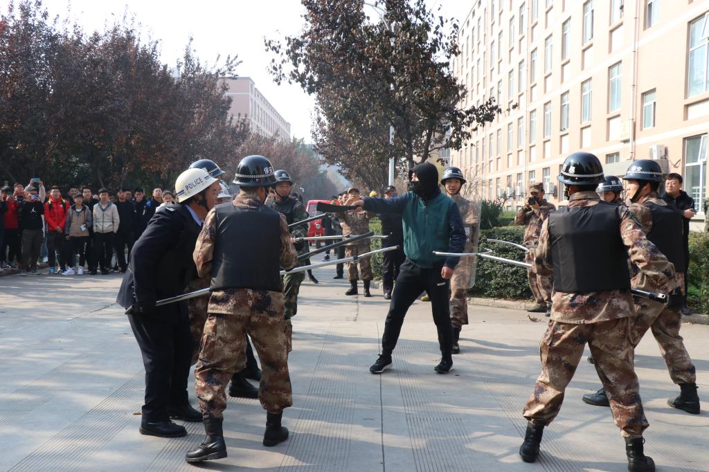 公安阎良分局蓝天路派出所、学校保卫处、反恐防暴应急队共30余人参加了反恐应急处置演练。演练模拟2名校外人员拒不配合校卫人员证件查验,强行闯入校园,并拿出刀具对阻拦的校卫队人员和过往学生进行砍杀。学校反恐防暴应急队和校卫队接到报警后开展先期处置,对暴徒进行围堵,蓝天路派出所民警赶到后与劫持人质的暴恐分子进行对峙,在谈判无效的情况下开展武装突击,两名暴恐分子均被抓获,演练取得圆满成功。