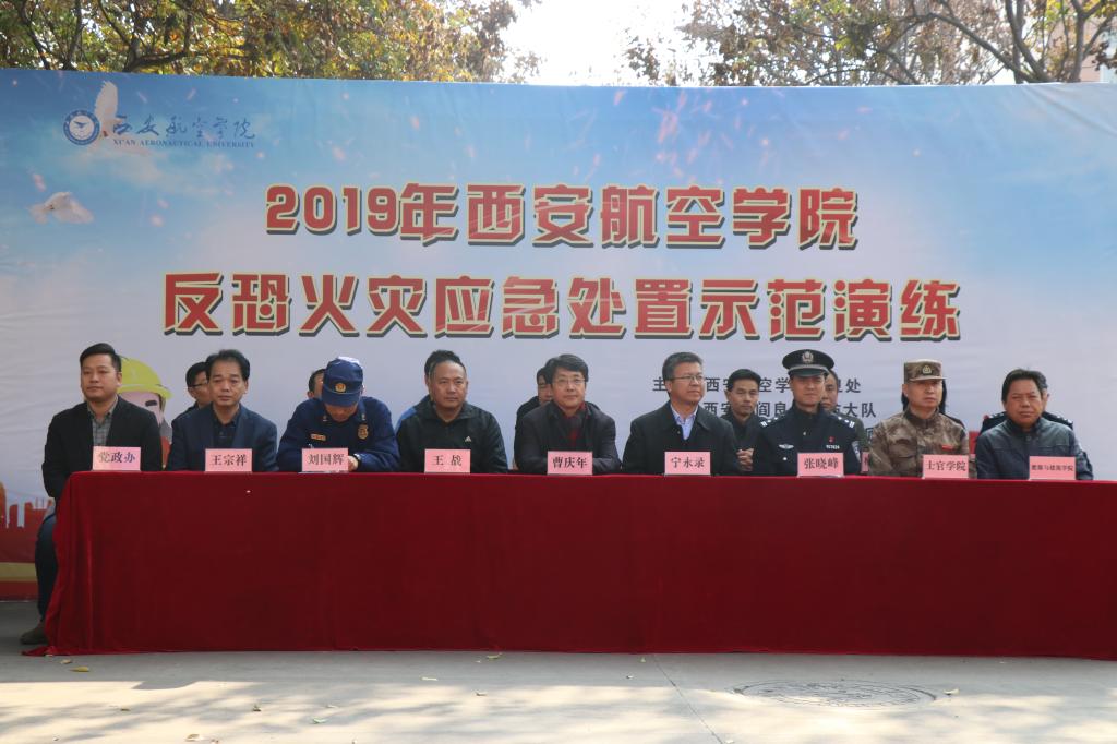 11月21日,2019年西安航空学院反恐火灾应急处置示范演练在阎良校区举行。校长曹庆年、副校长宁永录,西安市公安局阎良分局国保大队、蓝天路派出所、西安市阎良区消防大队,学校保卫处、党政办、教务处、学生处、校团委、后勤保障处、校办工厂、图书馆及阎良校区各二级学院有关负责人及300余名师生现场观摩演练。演练由保卫处主办,士官学院及能源与建筑学院承办。