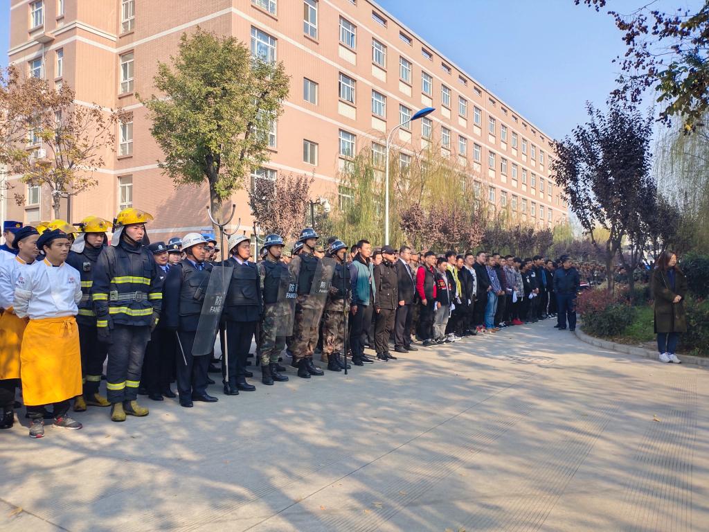 阎良区消防大队、学校义务消防队、士官学院、能源与建筑学院等700余名师生参加了火灾应急处置演练。演练模拟3#学生公寓一间宿舍发生火情,公寓值班员接到学生报告后向学校报警中心报警,同时鸣响楼内警报,值班员指挥学生向楼外有序疏散,并持灭火器处置初起火灾。报警中心立即指挥学校义务消防队迅速赶往现场灭火,同时,根据火情拨打火警电话“119”报警。阎良区消防大队赶到后与我校义务消防队配合,利用消火栓及消防车辆成功扑灭公寓大火,防止了火灾事故的蔓延。