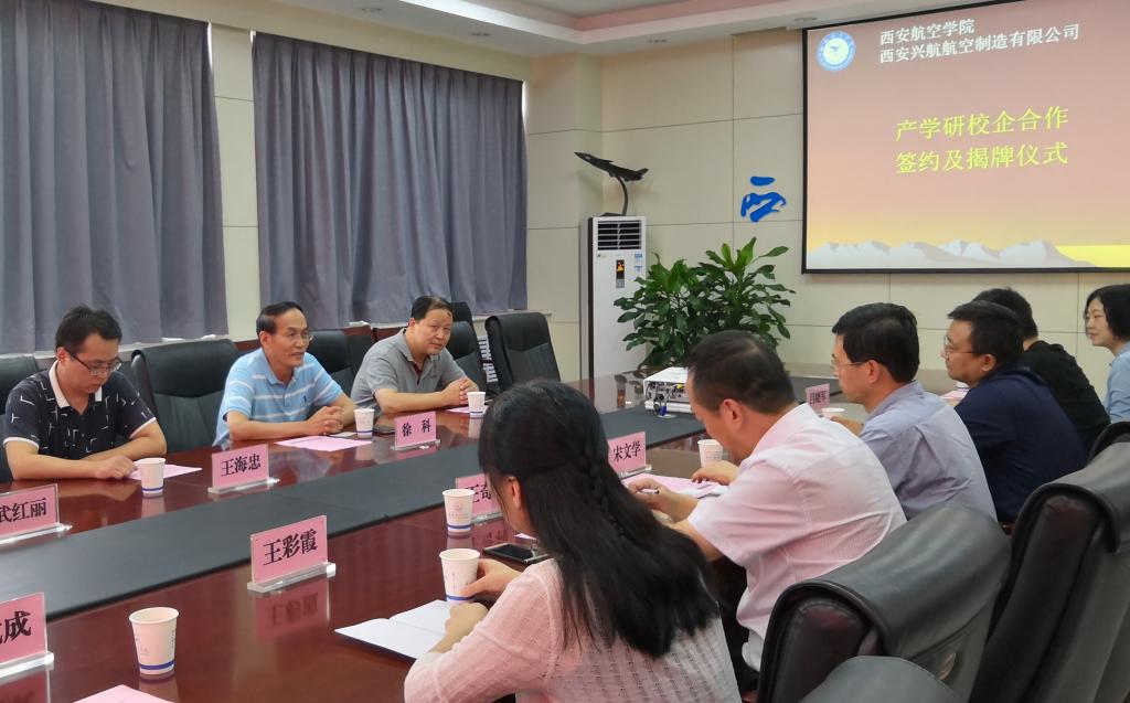 7月9日下午,西安航空学院与西安兴航航空制造有限公司校企合作签约仪式及“钛合金及铝合金加工研究中心”“西安航空学院校外实习基地”揭牌仪式,在我校阎良校区科教楼第一会议室举行。西安兴航航空制造有限公司董事长徐科、副总经理王海忠及综合办武红丽部长,我校副校长宋文学,机械工程学院党总支书记王奇利、副院长周小勇、机制教研室主任杨武成、实验中心主任吕晓军、省级教学名师王彩霞教授以及教师代表杨威、王莹博士等出席签约及揭牌仪式。签约仪式由杨武成主持。