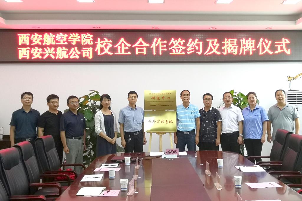宋文学和徐科分别代表校企双方在合作协议上签字,并共同为校企共建“钛合金与航空铝合金加工研究中心”和西安兴航航空制造有限公司“西安航空学院校外实践基地”揭牌。
