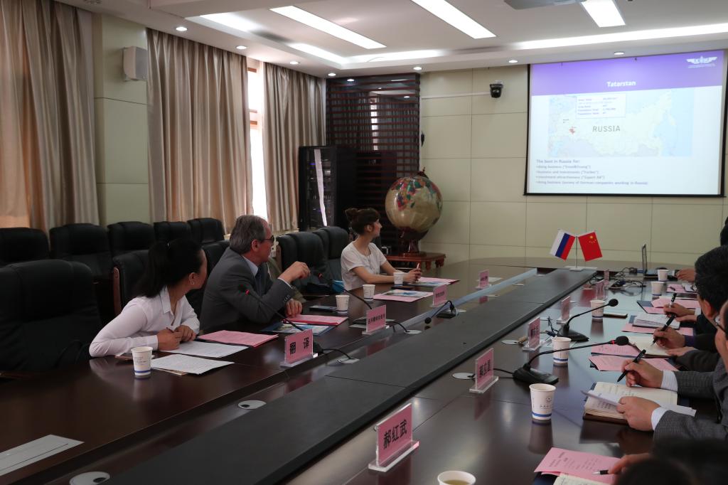曹庆年校长代表学校对访问团一行表示热烈欢迎,并介绍了我校的历史沿革、发展现状、特色学科专业建设以及国际合作交流等方面的情况。曹庆年指出,缘航空而生,依航空而立,随航空而动。建校60多年来,学校为航空工业和地方经济建设培养了7万余名专业技术人才。学校坚持走开放发展之路,努力推进国际化办学。中国和俄罗斯都具有悠久的历史和辉煌灿烂的文化,中俄互为最重要的战略合作伙伴,这些为中俄两方校际友好合作交流奠定了坚实的基础。中国政府“一带一路”战略构想为我校和喀山国立技术大学提供了难得的合作发展机遇。曹庆年向喀山国立技术大学对我校正在喀山实施的“航空产业高性能材料制备技术培训”团员的帮助与指导表示感谢,并希望两校以此为基础,在更高的层面上开展更加深入和广泛地交流,将两校间的友好合作关系推向新的高度。