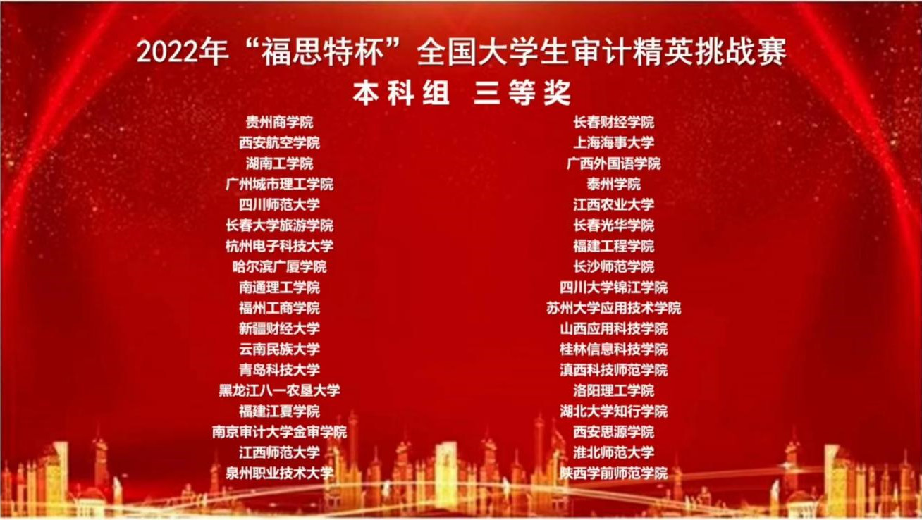11月26日,由中国审计学会审计教育分会主办,南京审计大学政府审计学院承办的第五届“福思特杯”全国大学生审计精英挑战赛于云端落下帷幕。本次大赛共有来自全国340所院校的390支队伍参加,其中研究生组72支代表队,本科组258支代表队,高职组60支代表队。我校由经济管理学院潘媛、王玥老师指导的财务管理专业邵睿思、刘栋波、刘映雪三位同学组成的参赛队,经过激烈角逐,最终荣获全国本科组三等奖一项。
