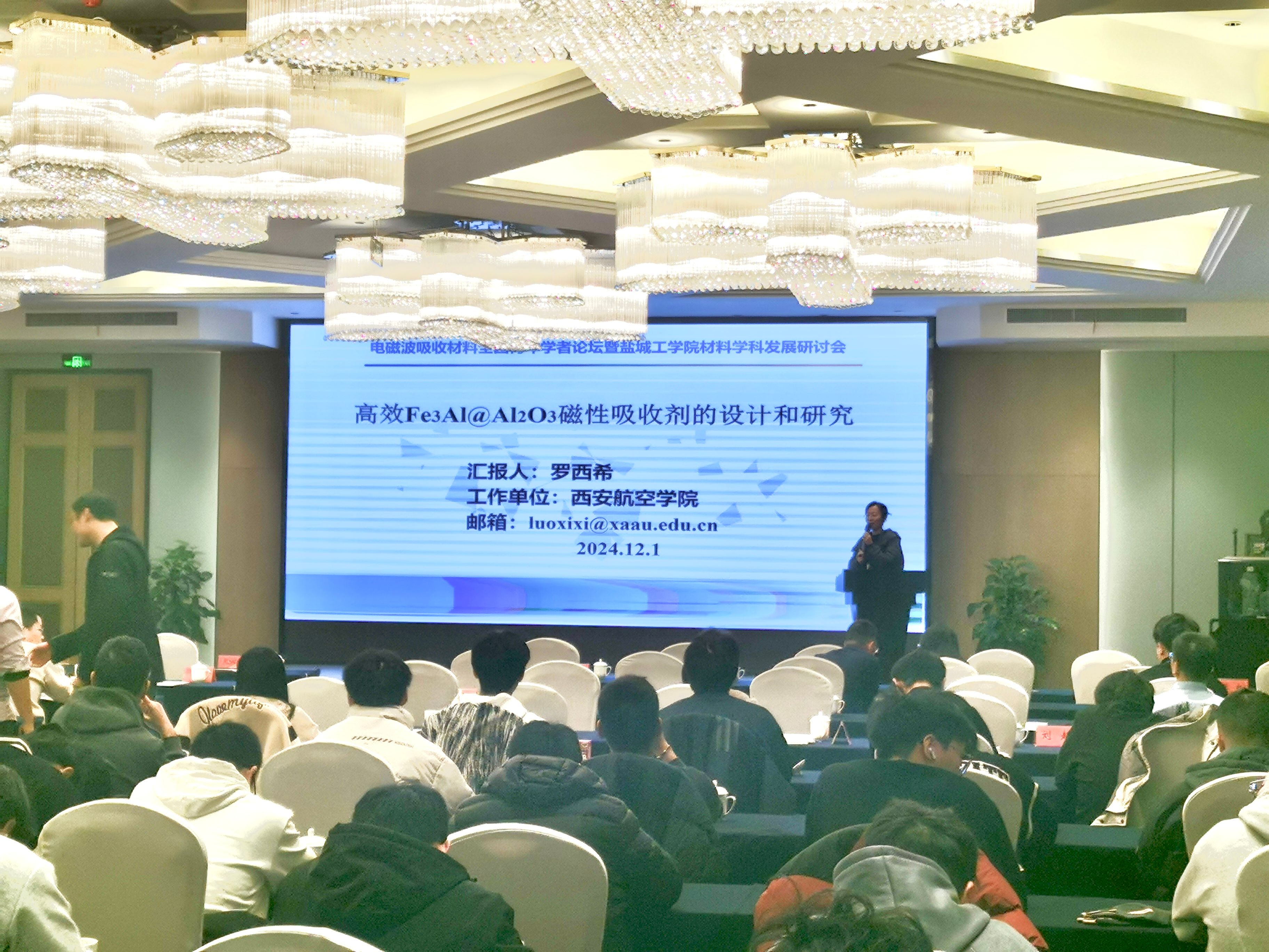 在此次论坛上,我校参会代表围绕航空材料领域的学科建设与技术研究,分享了学院的研究进展与实践成果:李鑫作《打造航空材料领域应用型学科——西安航空学院材料工程学院学科建设实践与展望》的报告。报告系统回顾了学院近年来在学科建设中的探索与实践,着重介绍了学院在航空材料领域的应用型学科发展成果和未来规划。罗西希作题为《高效Fe3Al@Al2O3磁性吸收剂的设计和研究》的报告。她的研究聚焦于新型电磁波吸收材料的开发,提出了一种基于Fe3Al@Al2O3磁性吸收剂的高效设计方案,并展示了该材料在电磁波吸收性能上的显著优势。该研究为解决当前航空航天领域对轻质化、高效化吸波材料的需求提供了新思路,得到了与会专家学者的高度评价。