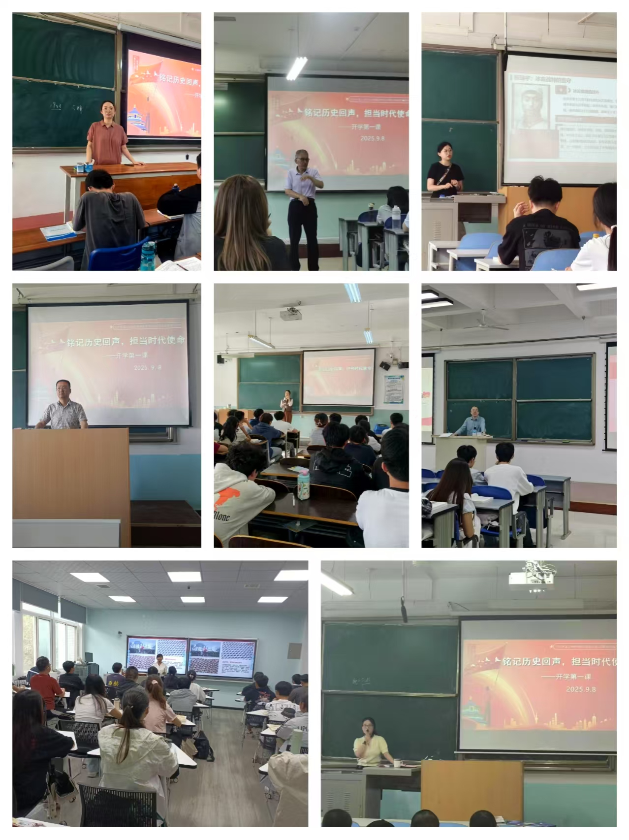 9月8日学生开学第一天,马克思主义学院“开学第一课"活动有序开展,教师们从“历史的回响、时代的强音、当下的对话、未来的使命”四个维度,为我校学生精心讲授开学第一课,学习伟大抗战精神,激发同学们的爱国情怀和历史责任感。