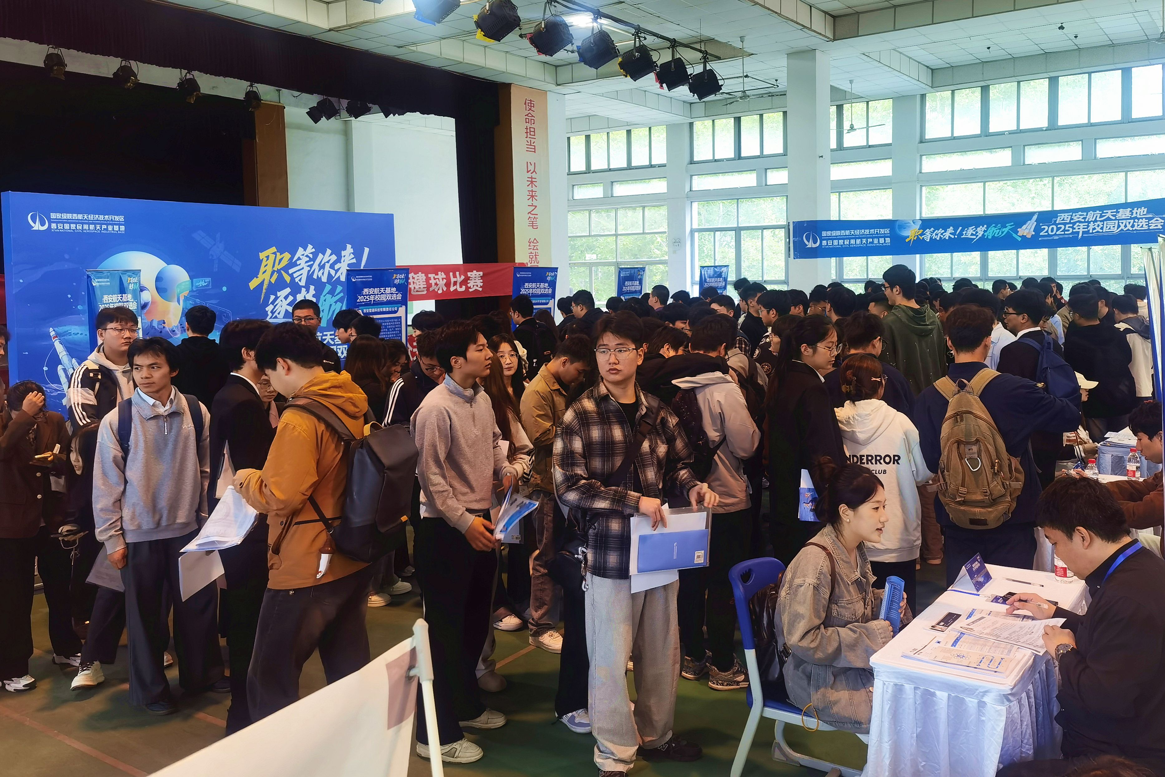 为促进我校毕业生高质量充分就业,10月16日,“职等你来,筑梦航天”西安航天基地2025年校园双选会在我校莲湖校区大学生活动中心成功举办。此次双选会是由西安航天基地管理委员会主办,集结了西安国家民用航天产业基地20余家企业,提供了包含商业航天、电子信息、生物医疗、低空经济、文化影视等多个领域300余个就业岗位,为学生提供多样化就业选择。