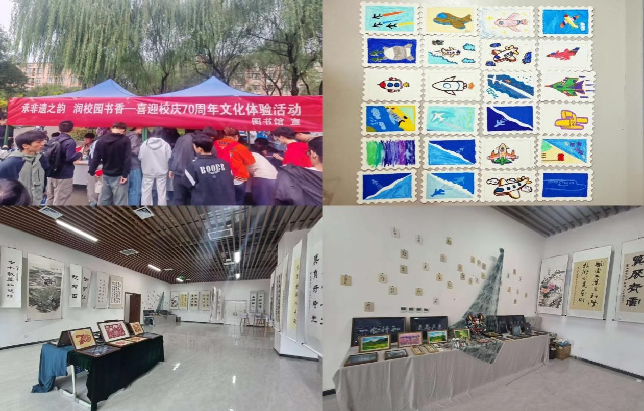 校庆期间,图书馆参展学校“墨绘七秩 影记岁月”师生书画摄影民俗展。在校园举办了“承非遗之韵 润书香校园”文化体验活动,吸引了大量校友和师生积极参与。在莲湖校区馆内展出了由馆员亲手制作的剪纸作品,为校庆增添了浓厚的喜庆氛围。此外,在校庆周里,图书馆读者协会的师生们开展了“手绘书签”“手绘邮票”等活动,每一枚作品都承载着对母校70周年华诞的美好祝愿。