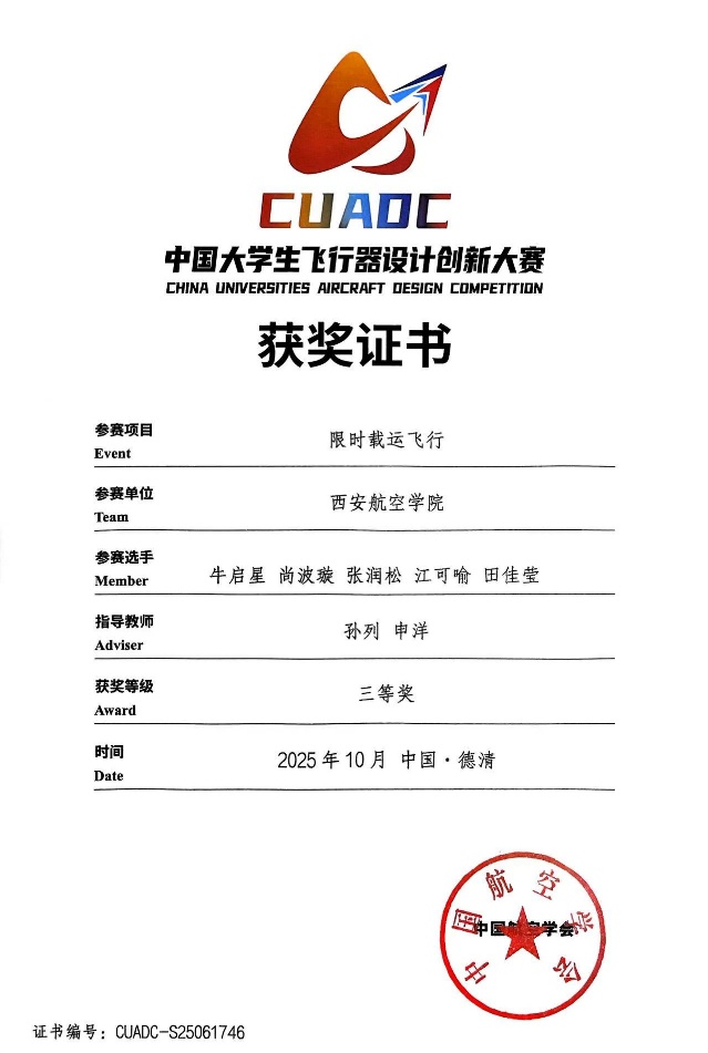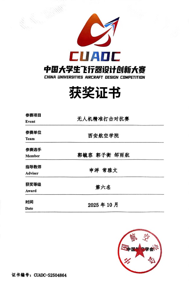 中国国际飞行器设计挑战赛是融合科技创新、工程实践与团队协作的高水平赛事,对培养学生科技创新能力、助力低空经济发展意义重大。我校将以此次获奖为契机,持续深化体教融合,推动学科实践与赛事育人深度结合,为社会输送更多高素质应用型人才。(文、图/飞行器学院(低空技术与工程学院) 申洋 审核/刘建强)