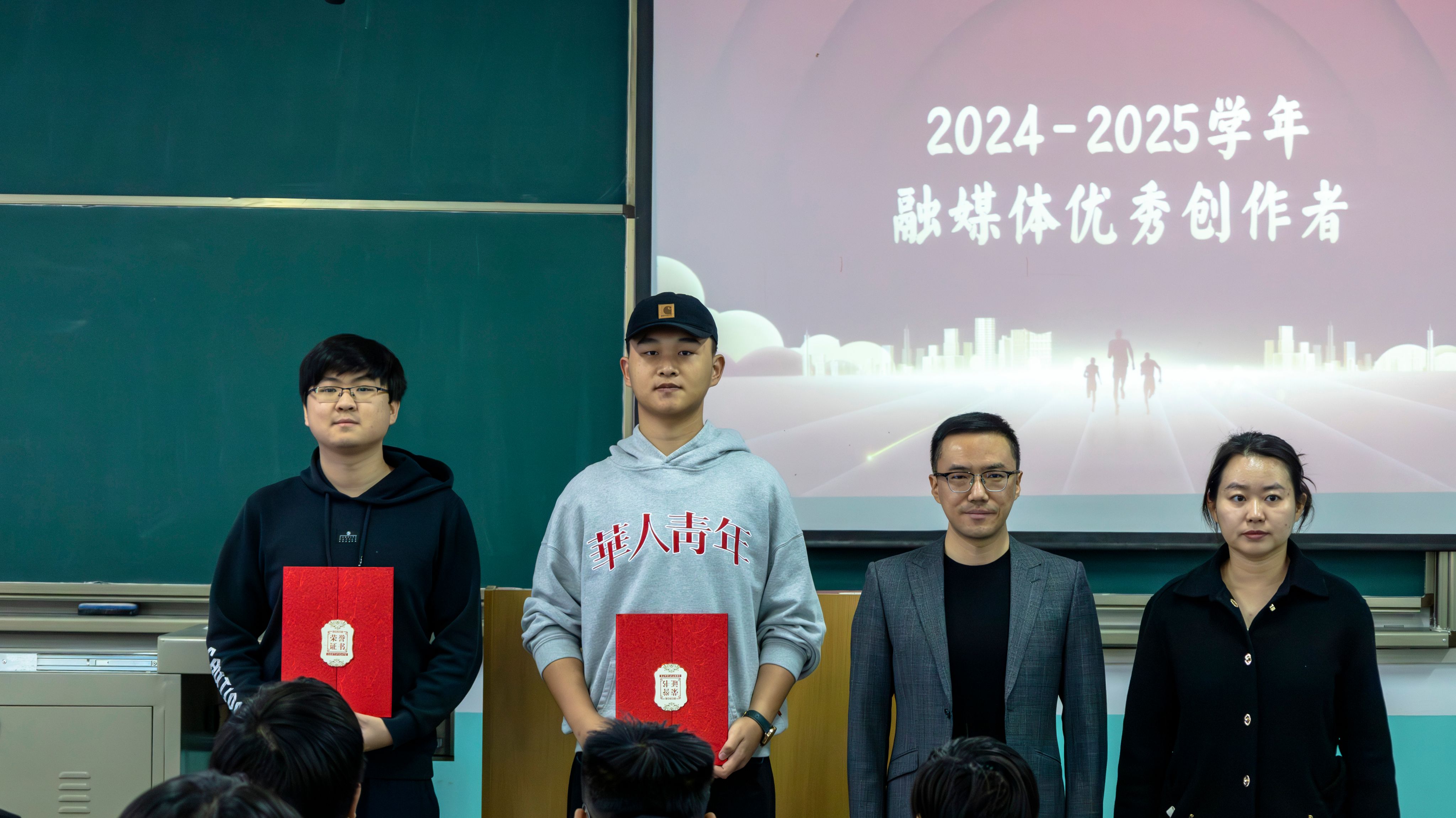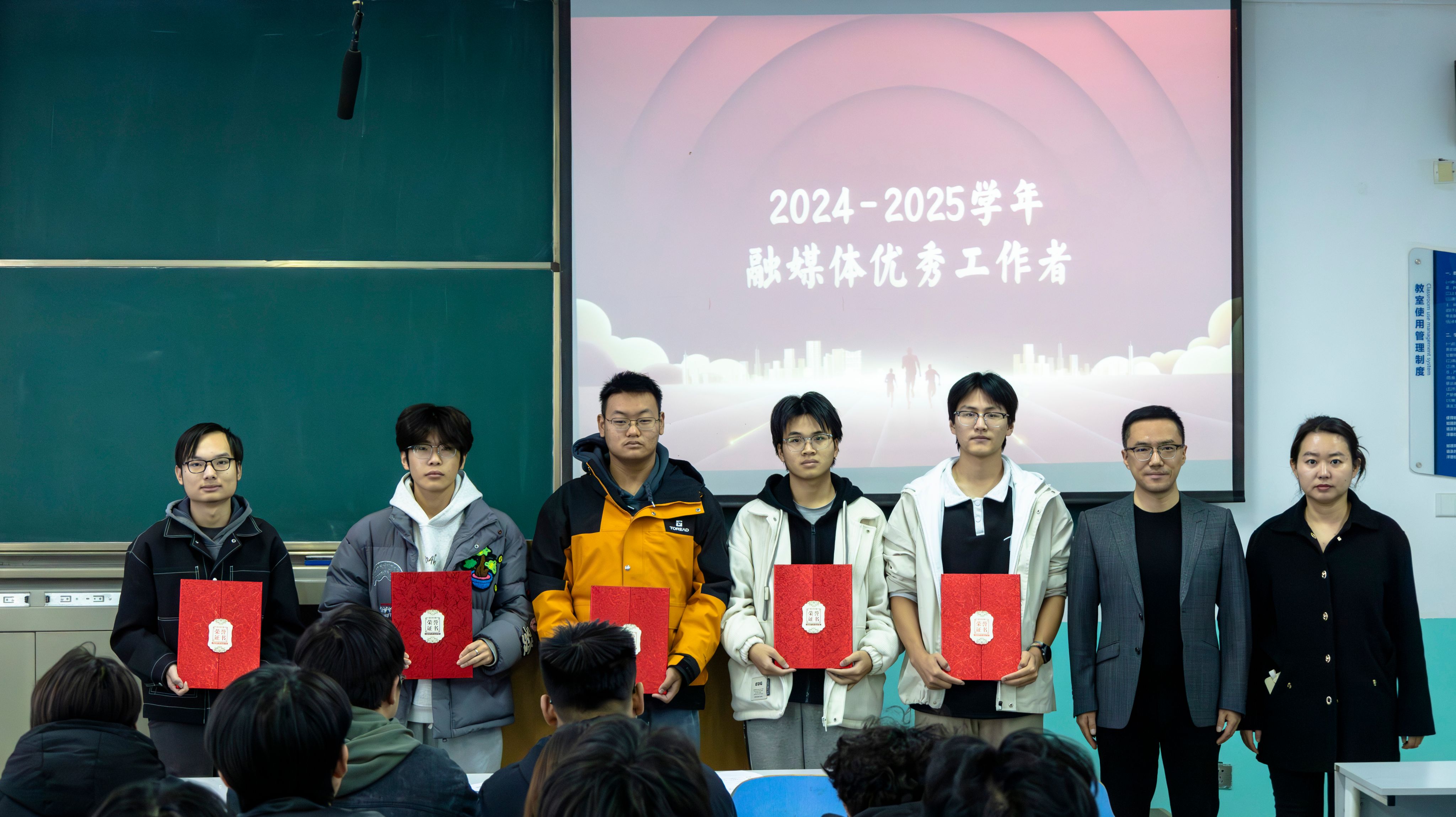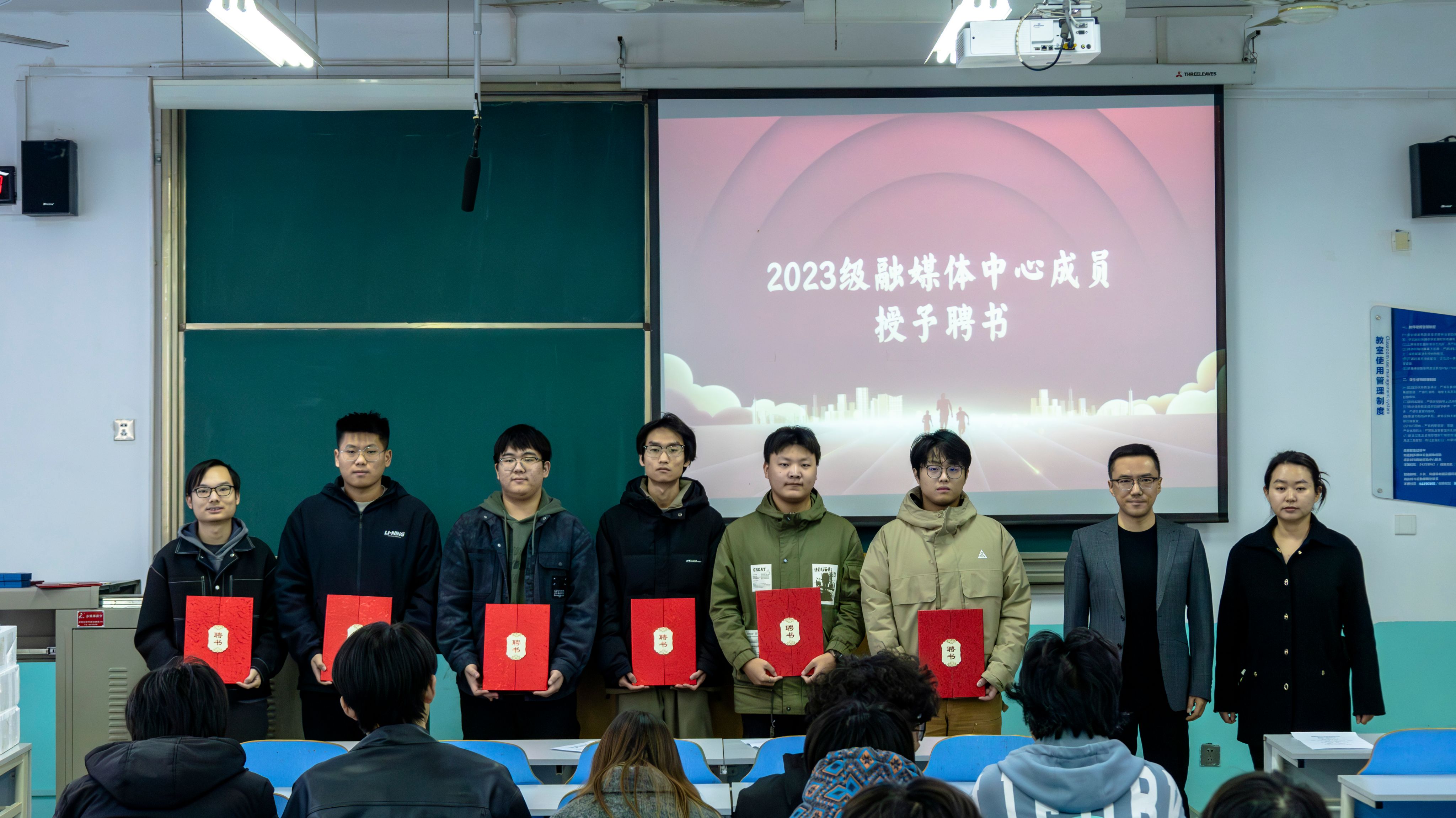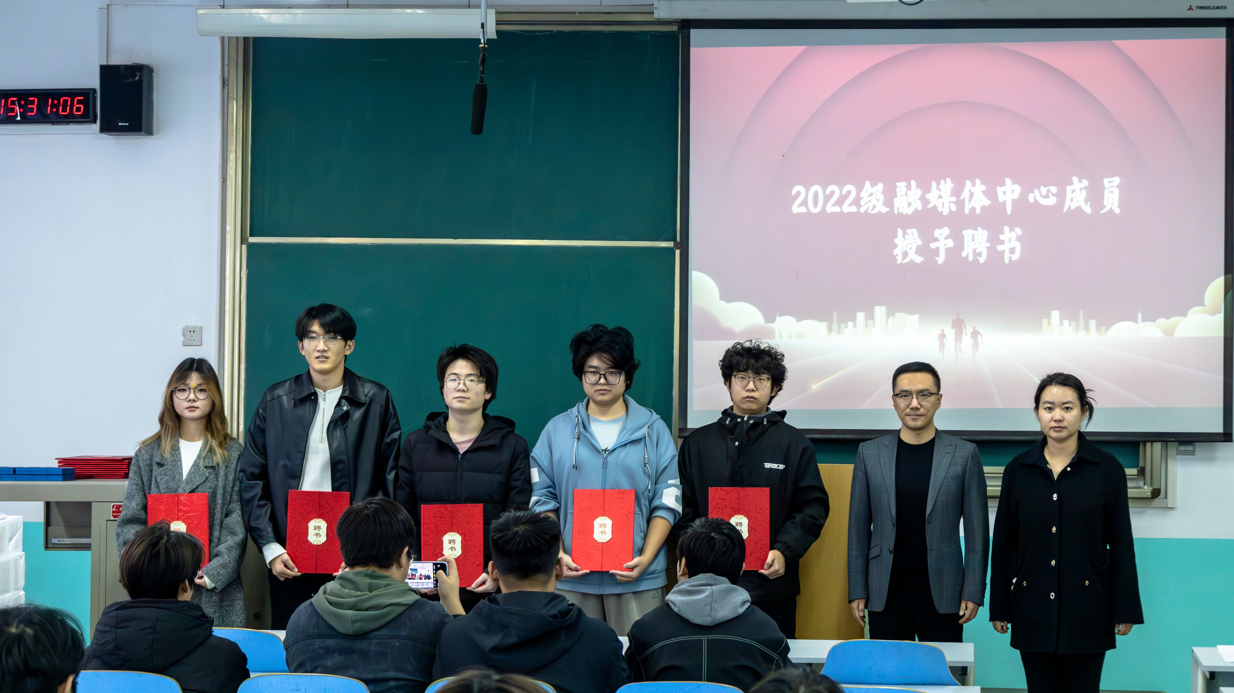 在表彰环节,战非宣读了年度各类奖项获奖名单,并为获奖个人颁发了荣誉证书。在授予聘书环节,童思思分别为2022级和2023级融媒体中心成员颁发聘书。