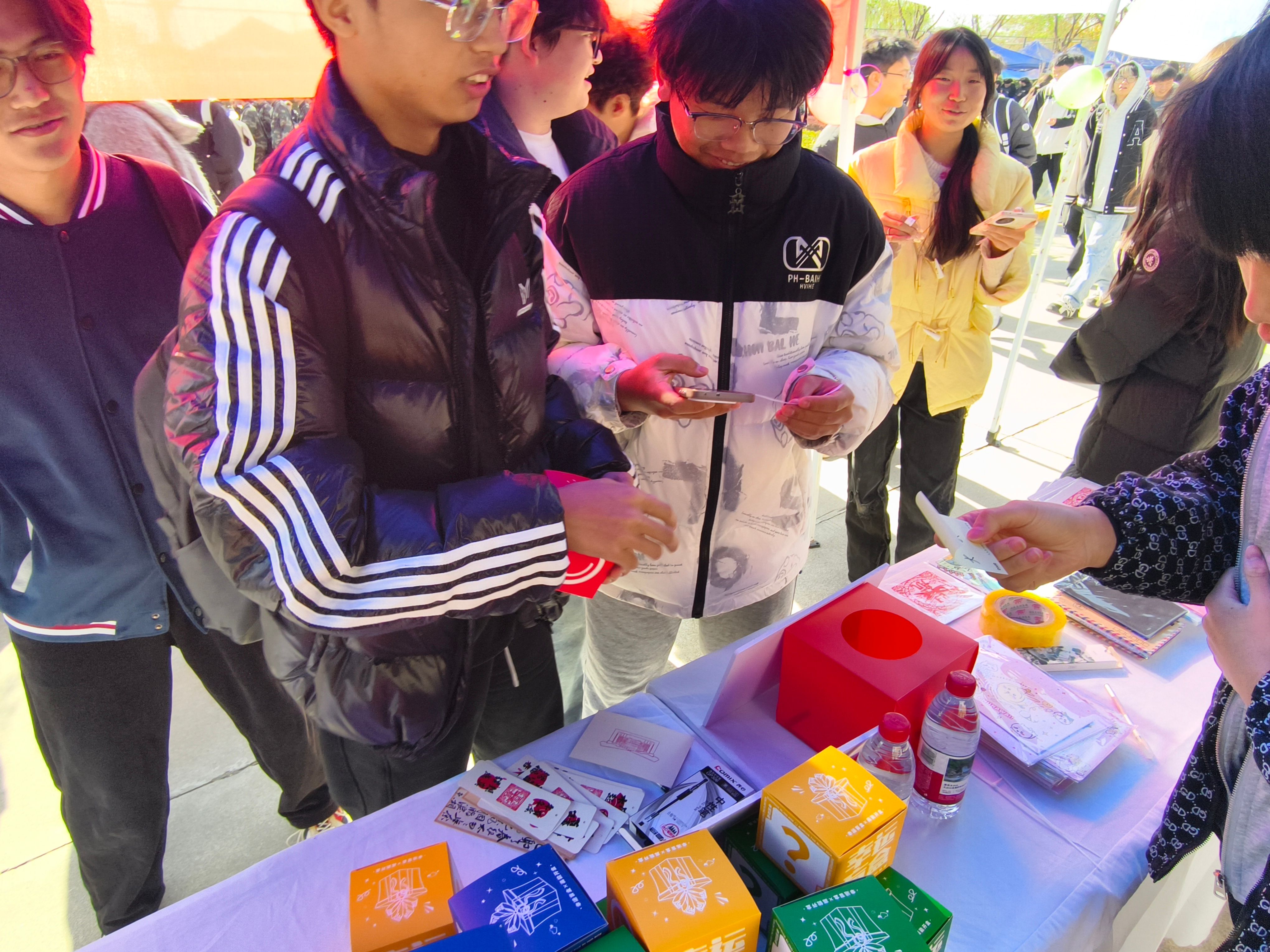 活动现场设置了知识竞答区、盲盒抽取区和时光胶囊书写区。同学们通过抽取竞赛题目,回答涵盖非物质文化遗产与图书馆服务的相关知识。答题正确者可参与盲盒抽取,获得图书馆文创拼图、书签、明信片等精美文创产品。