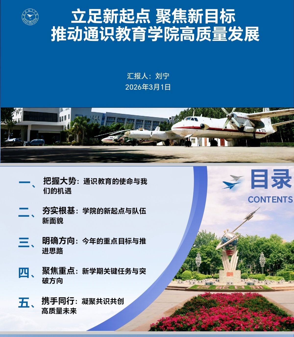 会上,刘宁院长做学院工作情况汇报,从把握大势、夯实根基、明确方向、聚焦重点、携手同行五个维度阐释了通识教育的时代使命与学院发展的历史机遇,明确了学院作为学校公共课程统筹平台的核心定位。同时,找准发展短板,坚持问题导向,精准施策补短板、强弱项、提质效。会议明确了学院2026年九项核心工作,部署了新学期五大重点任务。