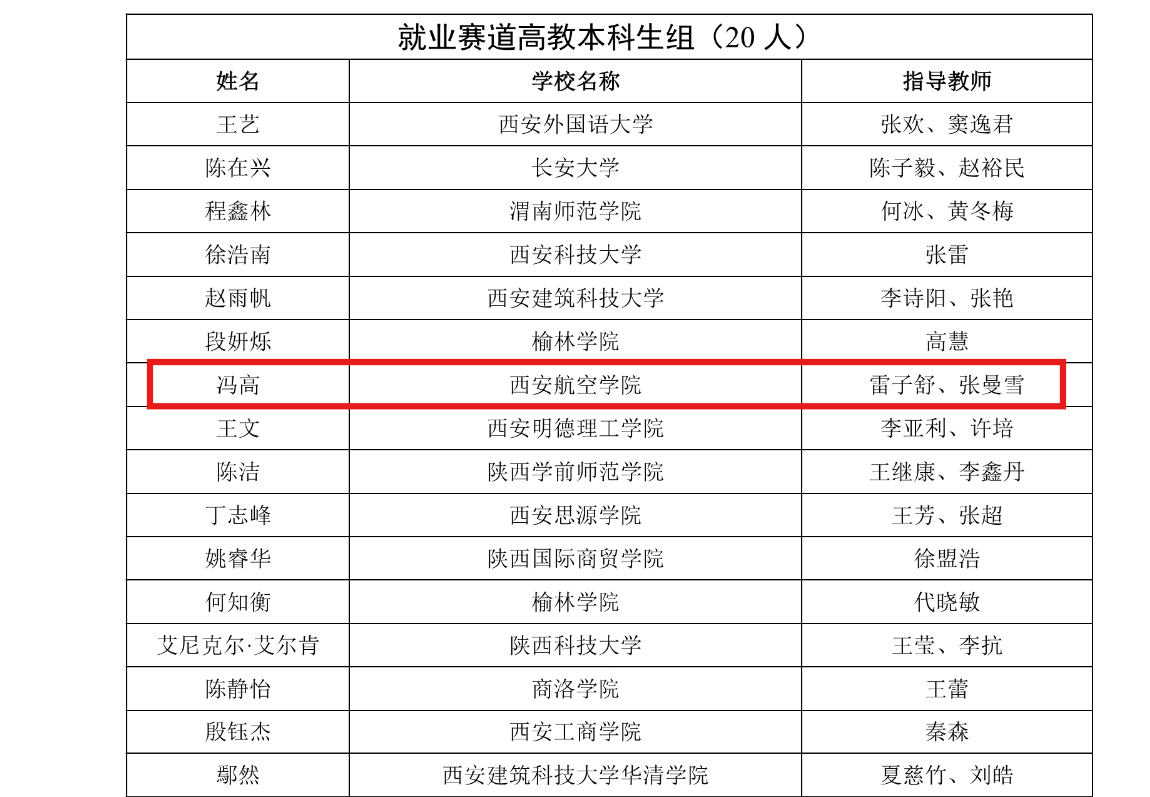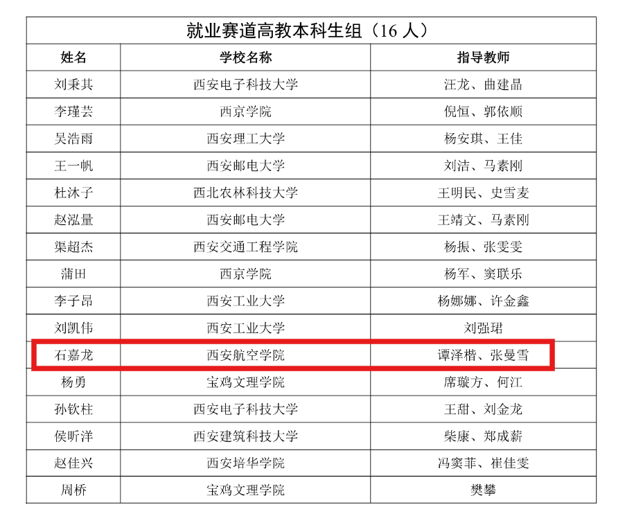 近日,第三届全国大学生职业规划大赛陕西省决赛在西北工业大学圆满落幕。我校电气与信息工程学院石嘉龙同学荣获就业赛道高教本科生组银奖、航空宇航学院(低空技术与工程学院)冯高同学荣获该赛道铜奖,取得我校在该项省级赛事中的新突破。