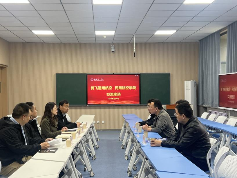 3月30日,翼飞通用航空股份有限公司钱集云董事长一行4人莅临民用航空学院走访交流座谈,共商校企协同育人与合作发展事宜。学院党总支书记丁琦、院长张琛及相关专业教师参加座谈交流,会议由丁琦主持。