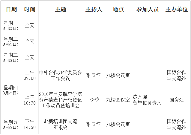 西安航空学院2015/2016学年第二学期第9周主要会议活动安排